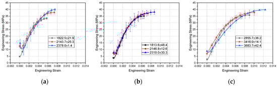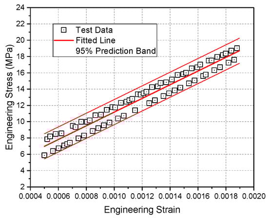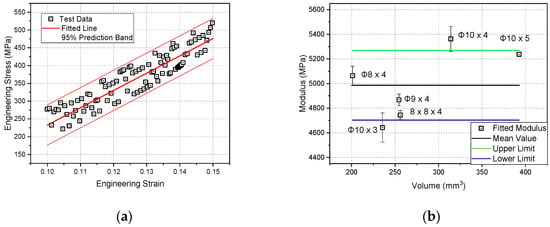 As shown in Figure 16a, the modulus of these specimens could be fitted using points in the linear period of the stress–strain curves. As shown in Table 2 and Figure 16b, the modulus values did not show a strong relationship with the thickness, area, volume, or shape of the specimen. The maximum relative error when comparing the mean values was 7.5458%.