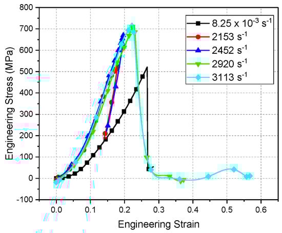 To avoid uncertainties related to size effects [17], the results of specimens of the same size under quasi-static and dynamic tests are compared in Figure 17. With regard to the evolution features, the dynamic stress–strain curves were different from the quasi-static stress–strain curve. During quasi-static loading, the stress increased as the strain increased, and finally the specimen failed at the fracture point. On the other hand, during dynamic loading, there were two different features after the peak point. One feature is that, when the strain rate was 2153 or 2452 s−1, there was a spring-back and the slope of the spring-back curve was similar. Another feature is that higher strain rates led to the specimens being damaged completely with the spring-back phenomenon disappearing.