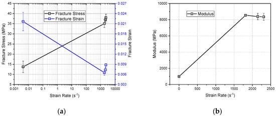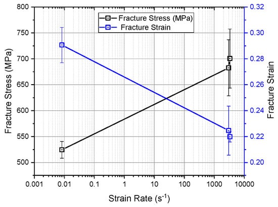 As shown in Figure 18, the fracture stress under high-strain-rate loading was higher than the fracture stress under quasi-static loading. Moreover, the fracture stress under high-strain-rate loading kept increasing as the strain rate increased, which can also be seen in Figure 11b. In contrast, the fracture strain under high-strain-rate loading was lower than the fracture strain under quasi-static loading. The quantitative results are provided in Table 3.