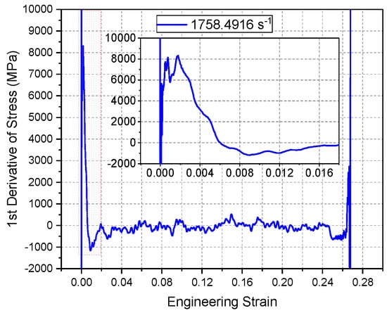 Zone 4: This period is called the fracture zone. The accumulation of microscopic damage resulted in the appearance of a macroscopic defect. The fracture of the material generated a rapid fall in the stress with a rapid increase in the strain rate. The presence of a second peak characterized the onset of macroscopic damage [48]
