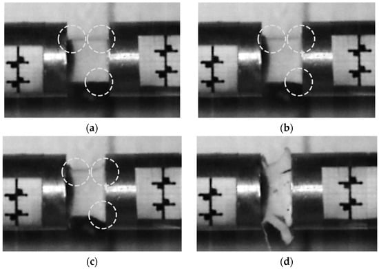 As shown in Figure 9 for the damaged test of the Φ9 × 4 specimen under 1.2 MPa, some features were apparent. A comparison with Figure 9a–c shows that the specimen became brighter. This was potentially because the space in the specimen was squeezed out and, thus, the specimen became compact. During this period, the input bar moved quickly toward the output bar until around 56.16 μs. Then, the relative speed of the input bar and the output bar became lower; this state was maintained for a while until around 126.88 μs. During this period, small amounts of fibers were squeezed out of the specimen, as indicated by the arrow in Figure 9d. At 126.88 μs, a large amount of fiber was squeezed out, as indicated in the circle of Figure 9e. From this moment on, the input bar again moved quickly toward the output bar. This was potentially because, along with large amount of fiber being squeezed out, the specimen began to fail and could not maintain the loading between bars anymore. These large chunks of fibers being squeezed out could also be seen in other records of the damaged tests. During this period, large chunks of fibers were squeezed out constantly along with the moving input bar. Finally, when the input bar stopped moving, only a small portion of the specimen remained between the two bars, as shown in Figure 9f. Correspondingly, the specimen was damaged completely and there was certainly no spring-back.