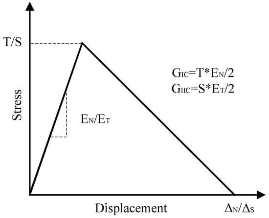 The sub-laminate was studied using the *MAT_COMPOSITE_FAILURE_SOLID_MODEL. The material parameters are shown in Table 9, and they were derived from Reference [4]. According to the current slope of the experimental stress–strain curves, Ea/Eb and Ec were estimated as 30 GPa and 4.7 GPa to get better agreement with the modulus [25]. The failure of layers during this loading direction was bending, and the bending strength was smaller than the punch-shear strength. The punch-shear strength of UHMWPE laminate is ~160 MPa [4]; thus, the Sca/Scb applied here, which was 70 MPa and smaller than 160 MPa, could be considered acceptable. The cohesive material parameters, which were mostly derived from Reference [24], are shown in Table 10, in which T is cited from Reference [14]. GIC and GIIC were equal to T*EN/2 and S*ET/2, respectively, as shown in Figure 33.