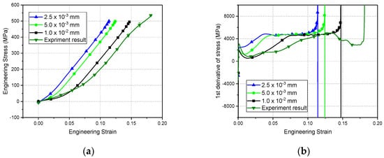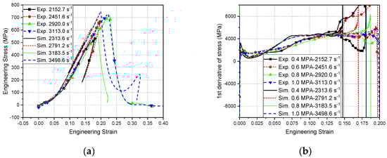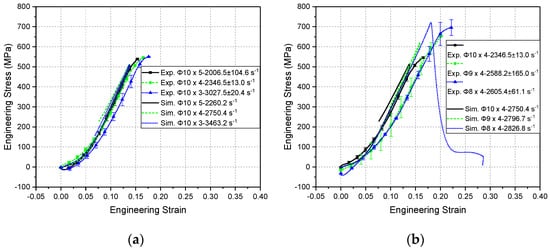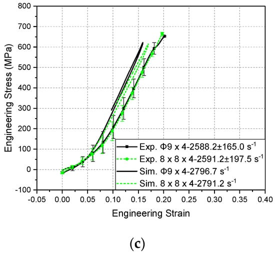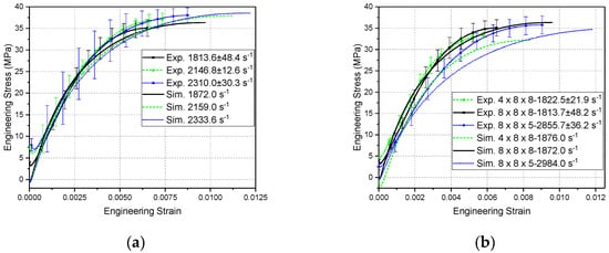 As the simulation results show in Figure 48a, with the strain rate increasing, the maximum stress increased as well. This trend was the same as the experimental trend. As shown in Figure 49a, in both simulation and experimental results, before a certain point, the slope of the stress–strain curve decreased with increasing strain rate. After this point, the slope of the stress–strain curve increased with increasing strain rate. However, the range is not great. As shown in Figure 48b and Figure 49b, both simulation and experiment results showed that, when the thickness and area became smaller, the slope values of stress–strain became lower. Moreover, the influence of thickness was greater than the influence of cross-section area. The specific maximum stress values are provided in Table 11. The biggest and smallest relative errors between simulation and experiment were 3.4% and 0.8%, respectively. Therefore, the simulation results had good agreement with the experimental results.