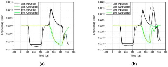 Furthermore, when it comes to aligning the wave head, there are many methods. Shang [45] considered that, when changing the position of the three wave heads, if the stress–strain curves generated by the two-wave method and three-wave method could be aligned at the maximum strain point, the head of the three waves could be considered as aligned. Some researchers calculated the wave head differences by measuring the distances between the strain gages and the ends of the bars in contact with the specimen, as well as by measuring the wave speed of the bars and evaluating the wave speed of the specimen [46]. Under ideal conditions, this method could get more accurate results. However, if the wave speed of the specimen is not clear enough [47] or the measurements of the lengths are not accurate enough, applying the same value for each specimen could lead to the result of each specimen being inaccurate. The method applied here was as follows: when changing the position of the reflected and transmitted waves, if the standard deviation of was the minimum, the head of the three waves could be considered as aligned.