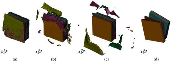 The simulation failure process under 0.2 MPa loading is shown in Figure 46. The input bar was at the right side of the specimen. The corner of the specimen in contact with the input bar was squeezed vertically. This moment occurred at 25 μs, which was similar to the experimental 23.69 μs. After 55 μs, gaps between sub-laminates began to generate. By comparing Figure 46c at 201.38 μs with Figure 24d at 200 μs, it can be seen that both simulation and experimental results showed that some sub-laminates were separate while some were still stuck to each other. Therefore, the simulation result had good agreement with the experimental result on failure morphology. It was discussed in Reference [17] that the slight general difference in fracture form at the four corners may be related to the experimental conditions; the geometry of the samples is not perfectly cubic and, thus, the parallelism of the faces in contact with the bars is not as perfect as in the numerical model.
