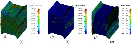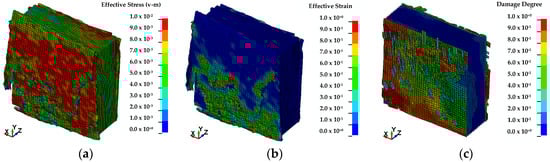 The contours of the simulation specimen under 0.2 MPa loading at a certain moment are shown in Figure 47. As shown in the simulation specimen in Figure 47a, the effective stress distribution at the center was relatively higher than the effective stress distribution near the vertical sub-layers. As shown in Figure 47b, the effective strain of the center at the end faces near the input and output bar had a higher value than the vertical corners and other regions of the specimen, which indicates that the elements in this region were squeezed the most. As shown in Figure 47c, a greater misalignment between two adjacent sub-layers resulted in a greater effective strain of cohesive elements in the corresponding region. At this moment, the misalignment of two adjacent sub-layers at the four vertical corners was greater than the misalignment at the center, and even greater than that in other regions. Thus, the effective strain of cohesive elements at the four corners was highest, followed by the center region. The cohesive element was deleted when the damage degree reached 1.0.