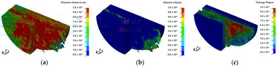 The contours of the specimen at 55 μs (unit: cm-μs-g): (a) effective stress of sub-laminates; (b) effective strain of sub-laminates; (c) damage degree of cohesive elements.