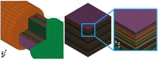 The FE model of bars and specimen is shown in Figure 44. The size of the specimen was 8 × 8 × 8 mm. The loading direction was parallel to the z-axis direction. The out-of-plane direction was parallel to the x-axis direction. The specimen was discretized into 96 sub-laminates to form the multiple layers through the thickness [4,23]. Each sub-laminate contained one layer of elements, as shown in detail in Figure 44, which represents one [0°/90°] stack. A layer of cohesive element between sub-laminates was applied [52]. As mentioned above, a small thickness was defined for the cohesive element to solve the over-penetration of elements to some extent [23]. A gap thickness of 0.001 mm was applied. Thus, the sum of all gaps was 0.095 mm, which is small (<5%) compared to the total thickness of specimen. The element size of the sub-laminate was 0.0833/0.0833/0.1667 mm. The total element amount of specimen was 880,128, in which the element amount of sub-laminates was 442,368 and the element amount of cohesive element was 437,760.