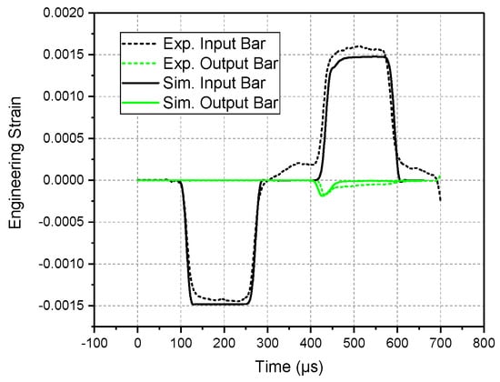 In order to compare the results with the initial wave obtained by the strain gauges in the experiments, two elements on the middle of the input and output bars were chosen to use their strain as initial waves. As shown in Figure 45, under 0.2 MPa loading, the value, wave length, and trend of strain of the simulation results were similar to the features of experimental strain.