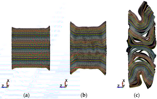 - In the out-of-plane dynamic simulation, a larger gap between sub-laminates caused the slope of the non-linear period of stress–strain curves to be shallower and longer; however, a larger gap did not clearly influence the slope of the linear period and the maximum stress. This indicates that the non-linear period was mainly caused by the compactness of the specimen.