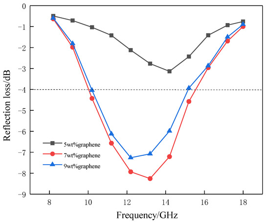 The reflection loss of graphene/PLA composite absorbers with different graphene content is presented in Figure 1. It can be seen that, in the frequency range 10.0–15.8 GHz, the reflection loss of 7 wt% graphene/PLA composite absorber is lower than −4 dB and the minimum reflection loss value is −8.3 dB at the frequency of 13.2 GHz; in the frequency range 10.2–15.2 GHz, 9 wt% graphene/PLA composite absorber has a reflection loss of less than −4 dB and a minimum reflection loss of −7.3 dB at the frequency of 12.2 GHz. The reflection loss of 5 wt% graphene/PLA composite absorber is higher than −4 dB in the whole frequency band tested, reaching the minimum reflection loss value of −3.1 dB at the frequency of 14.2 GHz.