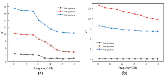 As shown in Figure 2, the real and imaginary parts of the complex permittivity of graphene/PLA composite absorber decrease with an increase of frequency. In Figure 2a, as the mass fraction of graphene increases, the real part of the complex permittivity of the composite absorber increases. When the graphene content is 9 wt%, the real part of the complex permittivity is the highest, and at 5 wt% it is the lowest, because as the mass fraction of graphene increases, the number of electric dipoles stored in the composite absorber increases, and the polarization of the electric dipole increases, resulting in an increase in the real part of the complex permittivity [9,10]. As shown in Figure 2b, when the graphene content is 7 wt%, the composite absorber has the highest complex permittivity imaginary part, followed by 9 wt% and the lowest which is 5 wt%. According to the theory of free electrons [11], , where is the electrical conductivity of the material, ω is the pi, and is the complex permittivity of free space. It can be concluded that the imaginary part of the complex permittivity is positively correlated with the conductivity. The electrical conductivity of the composite is 2.06 × 10−4 S/cm when the content of graphene is 5 wt%. When the amount of graphene added is 7 wt%, the electrical conductivity is significantly increased to 2.71 × 10−3 S/cm, indicating that the density of the three-dimensional conductive network is increased when the graphene content is increased from 5 wt% to 7 wt%. When the graphene content is 9 wt%, the electrical conductivity of the composite is 2.59 × 10−3 S/cm. Due to the enhanced adsorption between graphene, the dispersion state of graphene in the matrix is affected and the conductive network structure is destroyed, and thus the conductivity is dropped.