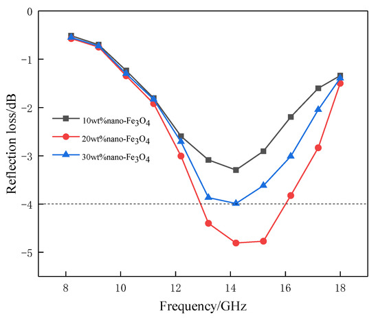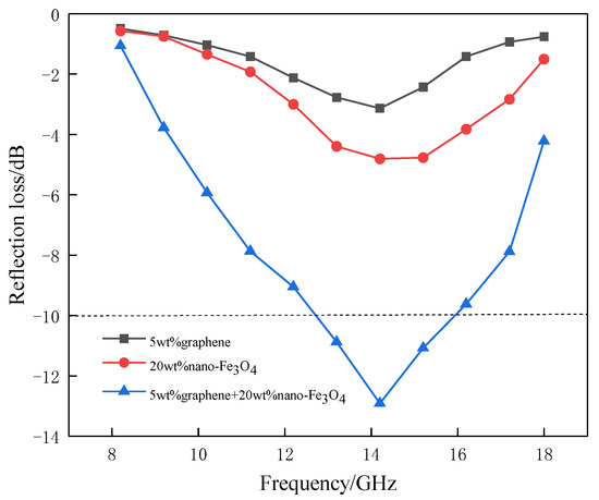 The reflection loss of composite absorbers with different absorbing agent composition is presented in Figure 8. It can be seen that as the frequency increases, the variation of the reflection loss of the three composite absorbers first decreases, and then rises. Among them, the reflection loss of graphene/nano-Fe3O4/PLA composite absorber is significantly lower than that of graphene/PLA and nano-Fe3O4/PLA composite absorbers, and the effective absorption bandwidth (RL ≤ −10 dB) of the graphene/nano-Fe3O4/PLA composite absorber is 3.6 GHz (12.4 to 16.0 GHz).