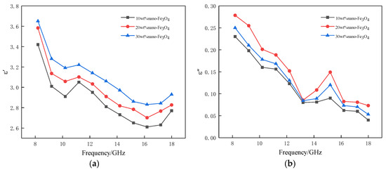 Complex permittivity of nano-Fe3O4/PLA composite absorbers with different nano-Fe3O4 content. (a) The real part of the complex permittivity; (b) the imaginary part of the complex permittivity.