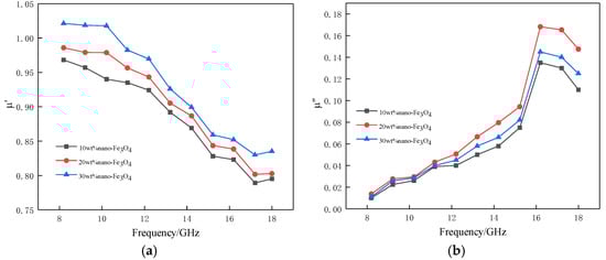 Complex permeability of composite absorbers with different absorbing agent composition. (a) The real part of the complex permeability; (b) the imaginary part of complex permeability.