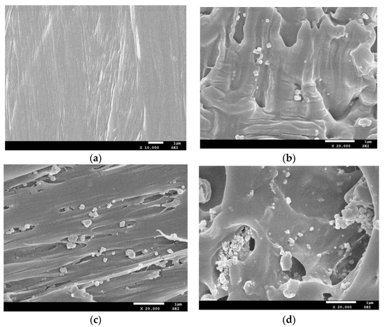 One of the earliest ferrites that people have come into contact with is Fe3O4. It has high dielectric and magnetic properties, etc., widely used in the field of absorbing waves [17]. Figure 7 shows a SEM cross-section of pure PLA and nano-Fe3O4/PLA composite absorbers. As can be seen from Figure 7a, the pure PLA section has no holes. When the content of nano-Fe3O4 is 10 wt%, as shown in Figure 7b, the nano-Fe3O4 magnetic microspheres begin to adsorb on the surface of PLA, forming “protrusions” with pores. These “protrusions” promote multiple reflection losses of electromagnetic waves inside the material, while holes can act as polarization centers, generating polarization and relaxation under varying electromagnetic fields, thereby consuming electromagnetic energy. When the addition amount of nano-Fe3O4 is 20 wt%, as shown in Figure 7c, more nano-Fe3O4 magnetic microspheres are adsorbed on the PLA surface, which promotes the loss and absorption of electromagnetic waves. When the amount of nano-Fe3O4 added reaches 30 wt%, as shown in Figure 7d, the nano-Fe3O4 magnetic microspheres are agglomerated and the pores become larger. Agglomeration affects the ability of electromagnetic wave loss, since large holes allow electromagnetic waves to pass through the material directly, which weakens the absorption performance.