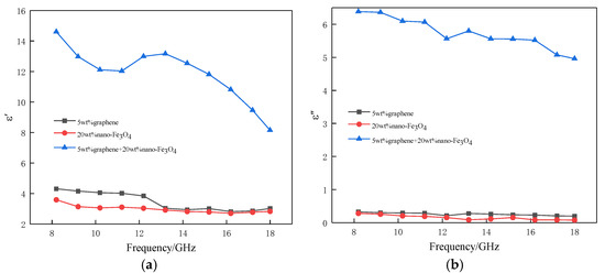 Complex permittivity of composite absorbers with different absorbing agent composition. (a) The real part of the complex permittivity; (b) the imaginary part of the complex permittivity.
