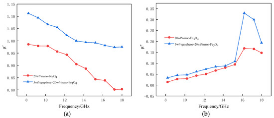 The complex permeability of composite absorbers with different absorbing agent compositions are shown in Figure 10. Since the graphene/PLA composite absorber does not have magnetism, it does not participate in the comparison. As shown in Figure 10a, as the frequency increases, the real part of the complex permeability gradually decreases, because the magnetization speed of the nano-Fe3O4 in the composite absorber cannot keep up with the speed of the magnetic field change, resulting in the magnetization relaxation phenomenon [19]. The complex permeability of the graphene/nano-Fe3O4/PLA composite absorber is higher than that of the nano-Fe3O4/PLA composite absorber, because in addition to the magnetic effect of nano-Fe3O4, the graphene/nano-Fe3O4/PLA composite absorber has a synergistic effect between graphene and nano-Fe3O4 [20]. Therefore, the addition of graphene improves the magnetic storage capacity of the material. It can be seen from Figure 10b that as the frequency increases, the imaginary part of the complex permeability first rises and then falls, and a resonance peak appears at 16 GHz, which is mainly caused by the natural resonance of the nano-Fe3O4 in the composite absorber. It is worth noting that the imaginary part of the composite permeability of the graphene/nano-Fe3O4/PLA composite absorber is higher than that of the nano-Fe3O4/PLA composite absorber, and the resonance peak is obviously improved. This is due to the fact that the addition of graphene leads to an increase in the anisotropy effect of the nano-Fe3O4 in the composite absorber, resulting in an increase in the magnetic loss of the electromagnetic wave.