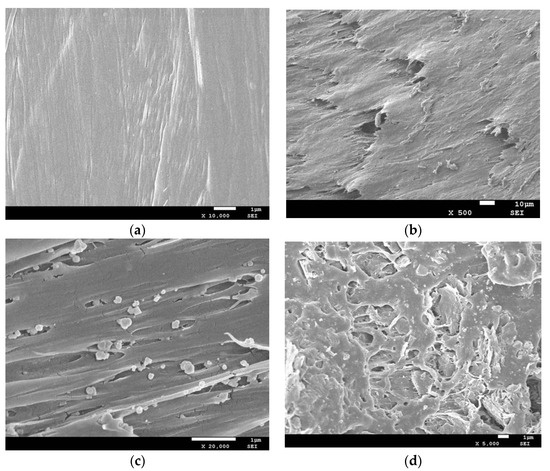 The SEM sectional view of PLA absorber and graphene/PLA composite absorbers are shown in Figure 3. It can be seen from Figure 3a that the pure PLA absorber has a relatively flat section. It can be seen from Figure 3b that the graphene is coated on the surface of the PLA matrix. Due to the stacking phenomenon between the graphene sheets, the wrinkles are more obvious when the amount of graphene is 7 wt% (as shown in Figure 3c). When the amount of graphene added is 9 wt%, as shown in Figure 3d, the graphene powders are agglomerated together and the absorbing property of the composite is weakened due to the presence of electron scattering. It can be seen that in the 8.2 to 18.0 GHz band, when the thickness of the composite part is constant, the absorbing property of the 7 wt% graphene/PLA composite is relatively better.