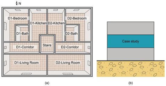 This case study corresponds to an experimental prototype reproducing usual parameters in residential buildings (Figure 1) and based on other existing research studies on the subject [34,35]. The prototype is an intermediate floor so slabs and ceilings can be considered adiabatic and heat transfers between the interior and the exterior occur only through the external walls. Likewise, all rooms except for the stairwell were considered as air-conditioned zones, and the same setpoint temperatures were used in all of them. The thermal properties of the opaque elements are specified in Table 2. As for windows, a design with a thermal transmittance of 4.2 W/(m2K) and a constant solar heat gain coefficient of 0.6 was considered.