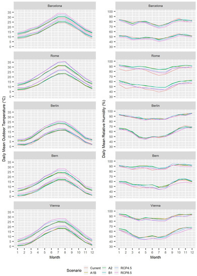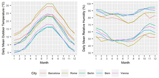 According to the Köppen-Geiger classification, the climate of Barcelona and Rome is Csa, which is characterized by dry and hot summers and mild winters. On the other hand, the climate of Berlin, Bern, and Vienna is Cfb, which is an oceanic climate with no severe winters. Figure 2 shows the daily mean maximum and minimum outdoor temperatures and relative humidity: The daily mean maximum outdoor temperatures in July are 29.3 °C and 31.1 °C in Barcelona and Rome, respectively, and 23.1 °C, 23.5 °C, and 24.7 °C in Berlin, Bern, and Vienna, respectively, whereas the daily mean minimum outdoor temperatures in January are 7.8 °C and 6.2 °C in Barcelona and Rome, respectively, and 1.1 °C, −0.2 °C, and 0.2 in Berlin, Bern, and Vienna, respectively.