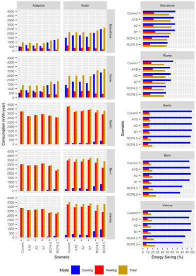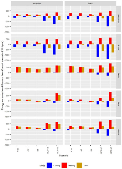 Regarding the adaptive total energy consumption, in Barcelona and Rome there was a reduction in the SRES scenarios between 59.29 and 99.34, and between 56.59 and 94.55 kWh/year, respectively, whereas in the RCP scenarios, there was an increase between 198.94 and 376.09, and between 356.76 and 445.79 kWh/year. In the cities of Berlin, Bern, and Vienna, this reduction in the energy consumption varied in the SRES scenarios between 311.98 and 513.89, between 114.15 and 136.67, and between 112.01 and 239.03 kWh/year, respectively, whereas this reduction was generally greater in the RCP scenarios, varying between 467.12 and 657.78; 101.17 and 553.17; and 460.90 and 495.85 kWh/year.