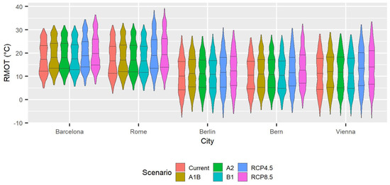 Violin plots of the RMOT in the different scenarios and cities. The horizontal lines in each violin plot refer to the 25%, 50% and 75% quartiles.