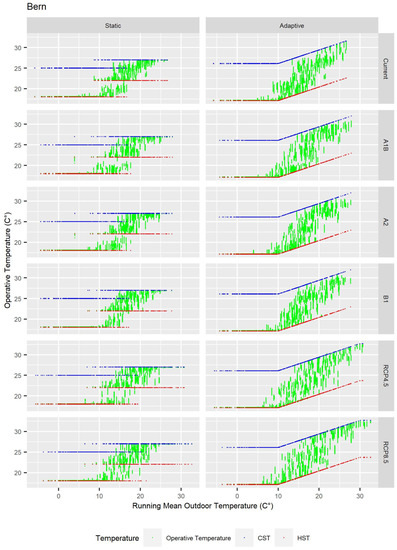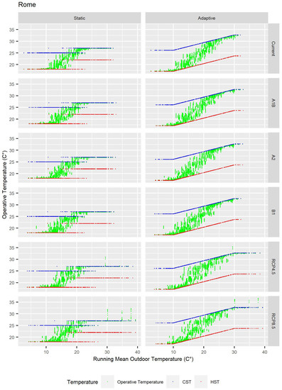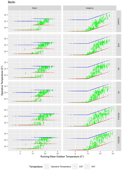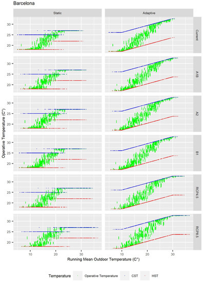 The rise of temperature consequently increased the running mean outdoor temperature. Figure 6 shows this increase in the 25%, 50%, and 75% quartiles, represented by horizontal black lines in each chart. In the cities of Barcelona and Rome, the average of the RMOT in the SRES scenarios increased between 0.5 and 1.1 °C, and between 0.2 and 0.6 °C, respectively, whereas in the RCP scenarios, the increase was between 1.9 and 2.9 °C, and between 2.6 and 3 °C. In the cities of Berlin, Bern, and Vienna, the average of the RMOT increased between 0.7 and 1.1 °C; 0.1 and 0.7 °C; and between 0.3 and 0.7 °C in the SRES scenarios, whereas in the RCP scenarios, it was between 1.6 and 2.1 °C; 1.4 and 2.7 °C; and 2.1 and 2.8 °C. This increase is also shown in Figure 7, Figure 8, Figure 9, Figure 10 and Figure 11, which include the cloud points corresponding to the operative temperature, the HST, and the CST in the static and adaptive model, as well as in the different scenarios and cities. As can be seen, all green points, which represent hours, were between the CST and the HST both in the adaptive and static model. As for the static model, there were two heating and cooling setpoint temperatures which corresponded to heating and cooling seasons. A heating and a cooling setpoint temperature corresponded to each hourly operative temperature. In such way, setpoint temperatures were horizontally extended, with operative temperatures so adjusted to the setpoint that they were almost hidden under each setpoint. There were also gaps in HST and CST as there were not any days with such temperature.