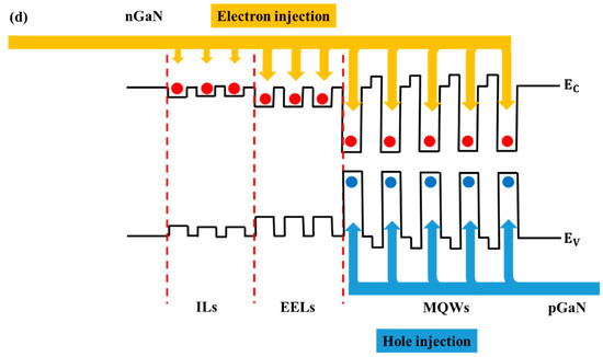 Figure 1b shows the schematic diagrams and TEM cross-sectional image of the layer structures grown on the sapphire substrates by MOCVD. The epi-structures were composed of n-type GaN/un-doped GaN layer, three pairs of Si-doped 2-/6- nm thick In0.01Ga0.99N/GaN interlayers (IL), and three pairs of 3-/12-nm thick In0.01Ga0.99N/GaN EELs. The last six pairs of InGaN/GaN MQWs with an 8-nm thick AlGaN barrier are clearly observable in the TEM image (Figure 1c), as is a p-GaN layer with 150-nm thickness. Figure 1d illustrates the schematics of band structures and current/carrier flow of UVLED with large bandgap barriers. The effective barrier heights for both electrons in conduction bands and holes in valence bands are reduced, attributed to the overflowing. Thus, the thermionic carrier escape rate from the MQWs to the barrier layers increases, especially at a higher carrier/current injection. The insertion of EELs/ILs surrounding the MQWs results in an increased effective electron capture rate, which leads to thermionic carrier leakage suppression.