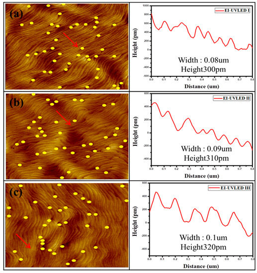 Atomic force microcopy (AFM) surface scan and line profiles of GaN/EELs/ILs for (a) EI-UVLED I, (b) EI-UVLED II, and (c) EI-UVLED III. Width and height are denoted in the figures.