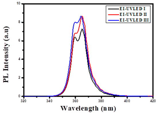 To investigate the optical properties of the epi-structure grown on EELs/ILs/n-GaN/u-GaN on substrate, we measured the PL of three samples as shown in Figure 3. Two separate emissions at 360 nm and 365 nm are clearly distinguished for all samples and related to emission from GaN and InGaN, respectively. EI-UVLED III with GaN barriers grown by the TEGa source has a PL intensity 1.2 times higher than EI-UVLED I consisting of EELs/ILs with GaN barriers grown with the TMGa source. The improvement of PL intensity in EI-UVLED III was attributed to the optimized growth condition, due to the improved crystalline quality resulting from insertion of the GaN barrier with the TEGa layer.