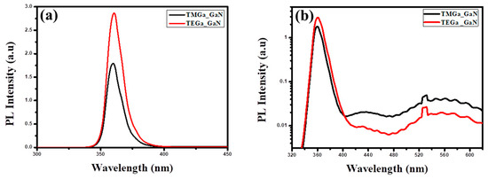 (a) PL spectra gathered from un-doped GaN grown with trimethylgallium (TMGa) and triethylgallium (TEGa) and (b) the spectra on a logarithmic scale.