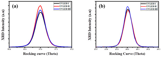 where N is the TD density, |b| is the magnitude of the Burgers vector ( [23], and β is the FWHM of the XRC. According to Equation (1), the density of screw dislocation in the GaN layer is 1.48 × 108, 1.42 × 108, and 1.25 × 108 cm−2, and density of edge dislocation is 5.60 × 108, 5.09 × 108, and 4.31 ×108 cm−2 for UVLED-I, -II and -III, respectively.