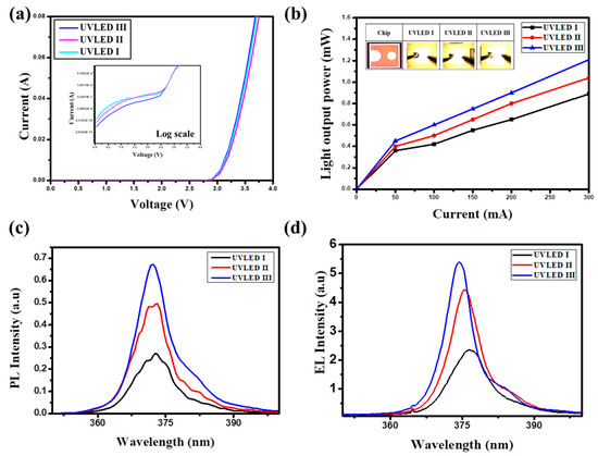 (a) Typical forward current–voltage (I–V) characteristics of UV-A LED (a semi-log plot is shown in the inset), (b) light output power as a function of injection current for three samples of UV-A LEDs, (c) PL, and (d) EL spectra of the UV-A LEDs.