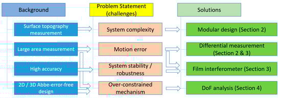 In order to address the challenges discussed in the above paragraph, a modular system for surface topography measurement was developed using conventional components. The central stages were mechanically tracked by optical encoders with consideration of the cost and robustness [31]. An optimal system design was proposed in order to address the challenge of the over-constrained mechanism. A film interferometer was developed to compensate for the straightness error from the motion system.