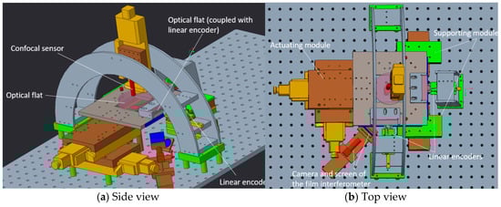 The system configuration of the proposed design is shown in Figure 2. The overall dimension of the system is L 890 mm × W 820 mm × H 675 mm. The measurement range is 100 mm × 100 mm × 50 mm. Like the first prototype, this system was built of aluminum alloy. The central stage was supported by two sets of 2D sliders and driven by a pair of actuators (Zolix uKSA 100, Zolix Instruments CO.,LTD, Beijing, China). Each uKSA 100 is able to achieve a travel range of 100 mm, which determined the measurement range of the presented system.
