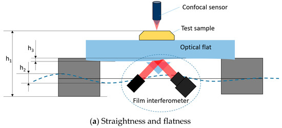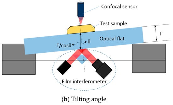 In Equation (1) is the height measured by the confocal sensor, represents the motion error caused by the linear guides, and is the height fluctuation due to the flatness error of the optical flat. T is the thickness of the optical flat and is its tilting angle during the movement.