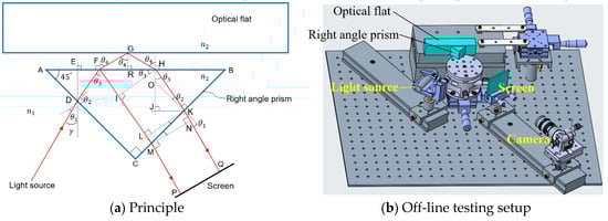 It should be highlighted that Equations (4)–(6) were approximately true because the optical flat was not ideally parallel with the bottom of the right-angle prism. When the angle between the two reflective surfaces was very small, the optical path differences , , and could be considered as a higher-order infinitesimal of the angle.