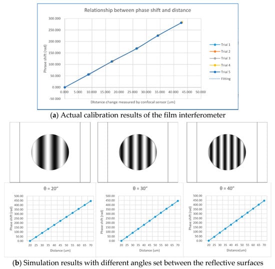 Although the angular motion errors may have changed the density and orientation of the interference stripes, the calculation of the phase using Equation (16) was not affected. The phase shifts calculated with Equation (16) and the distance change measured by the confocal sensor were plotted in the characteristic curve, as shown in Figure 7.