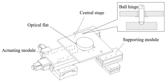 - The stage top was rigidly connected with the actuating module, and it was coupled with the two supporting modules through ball hinges.