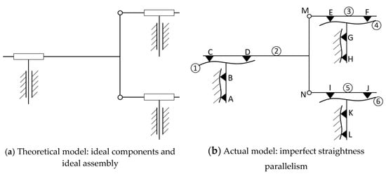 Mechanical model for DoF analysis: (a) Theoretical model: ideal components and ideal assembly, (b) Actual model: imperfect straightness parallelism.