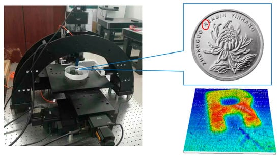 A coin was scanned using the proposed system, with a scan range of 2 mm × 2 mm and a spacing of 10 µm. The experimental setup and the scanned image are shown in Figure 10.