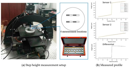 The step height made by gauge blocks was measured at four different locations in the system measurement area of 100 mm × 100 mm. The scan length of each measurement was 50 mm. At each location, the measurements were repeated five times. Figure 11a shows the experimental setup and Figure 11b shows the profile measured by the differential sensors. The differential setup is discussed in Section 2. Sensor 1 (confocal sensor) was used to measure the heights from the top, while sensor 2 (film interferometer) was used to measure the straightness error from the bottom.