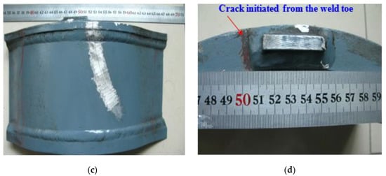 A crack was found at the spring sleeve of one metro bogie frame (as shown in Figure 1a) and the service life is less than 200,000 km. The spring sleeve of the frame side beam is welded by upper cover, lower cover and circular plate. The positioning block is welded to the spring sleeve lower cover by four welds, as seen in Figure 1b. The crack initiated from the weld toe of the positioning block and then propagated to the spring sleeve circular plate with maximum 110 mm in length, as shown in Figure 1c,d.