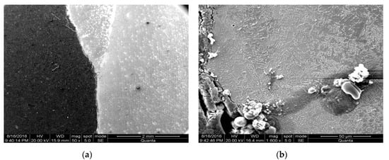SEM of weld toe: (a) 50×; (b) 1600×.