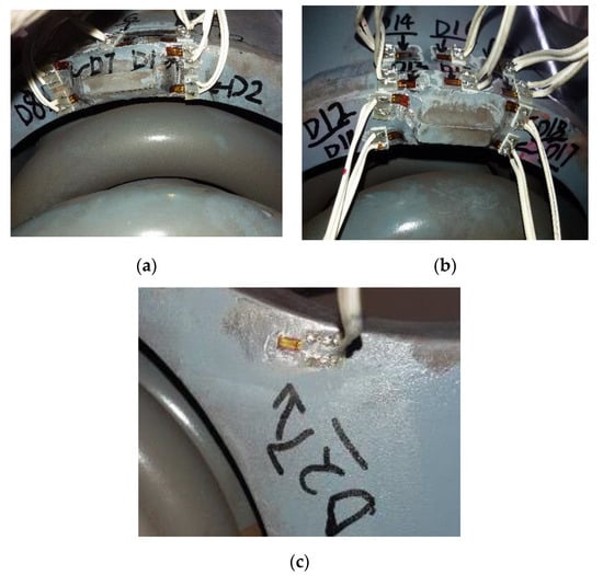 Strain gauge tested points around the positioning block: (a) D02; (b) D11 and D17; (c) D27.
