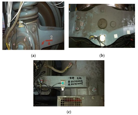 Vibration acceleration tested points: (a) sensor on the axle box; (b) sensor on the spring sleeve; (c) sensor on the motor.