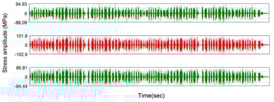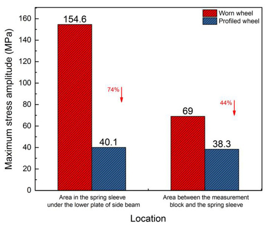 Figure 15 shows the comparison of the maximum dynamic stresses at D11 of the profiled and worn wheels. It can be observed that the maximum stress amplitude of the profiled wheel is significantly lower than that of the worn wheel, and the maximum reduction is 74%, indicating that the wheel polygon has a significant influence on the stress amplitude of the frame.