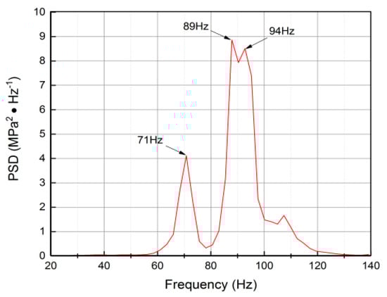 A typical stress time history signal of point D02 shown in Figure 8. The power spectral density (PSD) analysis and the speed-time-frequency relationship analysis of point D02 in some section are shown in Figure 9 and Figure 10, respectively. It could be observed that the dominant frequencies are 71 Hz, 89 Hz and 94 Hz and strongly relevant to the operating speeds. This demonstrates that these frequencies are not the structural natural frequencies and there is no obvious behavior of the resonate vibration.