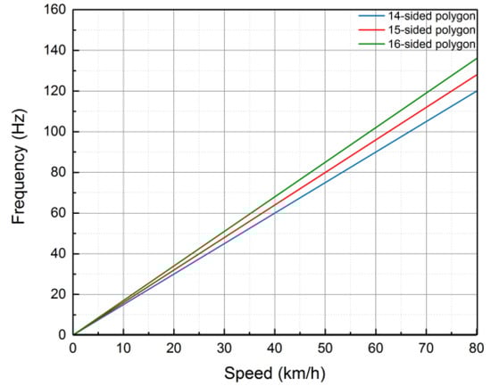 The wheel polygon will worsen the wheel-rail force and cause the high vibration of the axle box and bogie frame. The excitation frequencies of 14- to 16-side polygon wheel are coincided with the running speed linearly, shown in Figure 13. As indicated by the 15-sided wheel polygon analysis, for an example, when the operating speed is 54 km/h, the dominant frequency of the wheel-rail excitation is 86 Hz. Further, according to the analysis results of Figure 8 and Figure 10, it can be observed that the dominant frequency of the wheel-rail excitation (86 Hz) is similar to the dominant frequency (89 Hz) of dynamic stress amplitude at point D02 in 54 km/h.